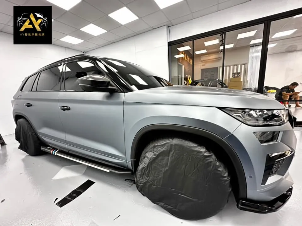 車款:Skoda Kodiaq RS 施工項目: 全車改色消光金屬灰藍色 客製化懸浮式鋼琴烤漆亮黑色 書包改色 犀牛皮碳纖維色